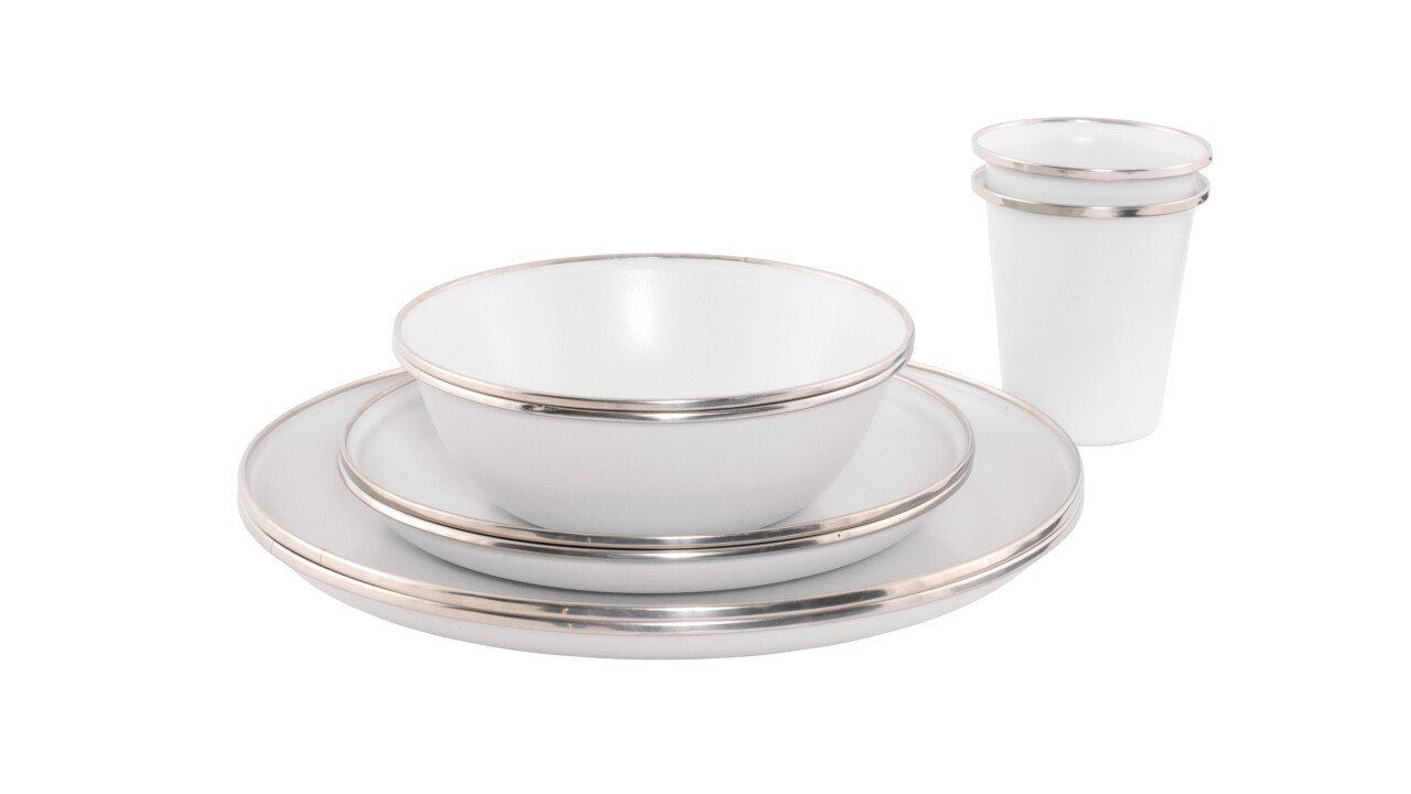 The Outwell Delight Dinner Set is made from luxury enamel. It has a stainless steel edge rim for a softer touch, is light in weight, and is scratch-resistant, making it a desirable dinner set.