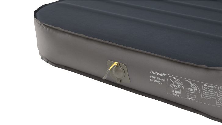 The Dreamboat range of single and double designs in various thicknesses features the Outwell FHF (Flat High-Flow) valve with an enhanced air flow for both inflation and deflation. Its vertical side static fabric panels do not bend under pressure, thus aiding easy inflation as less air needs to be pumped.