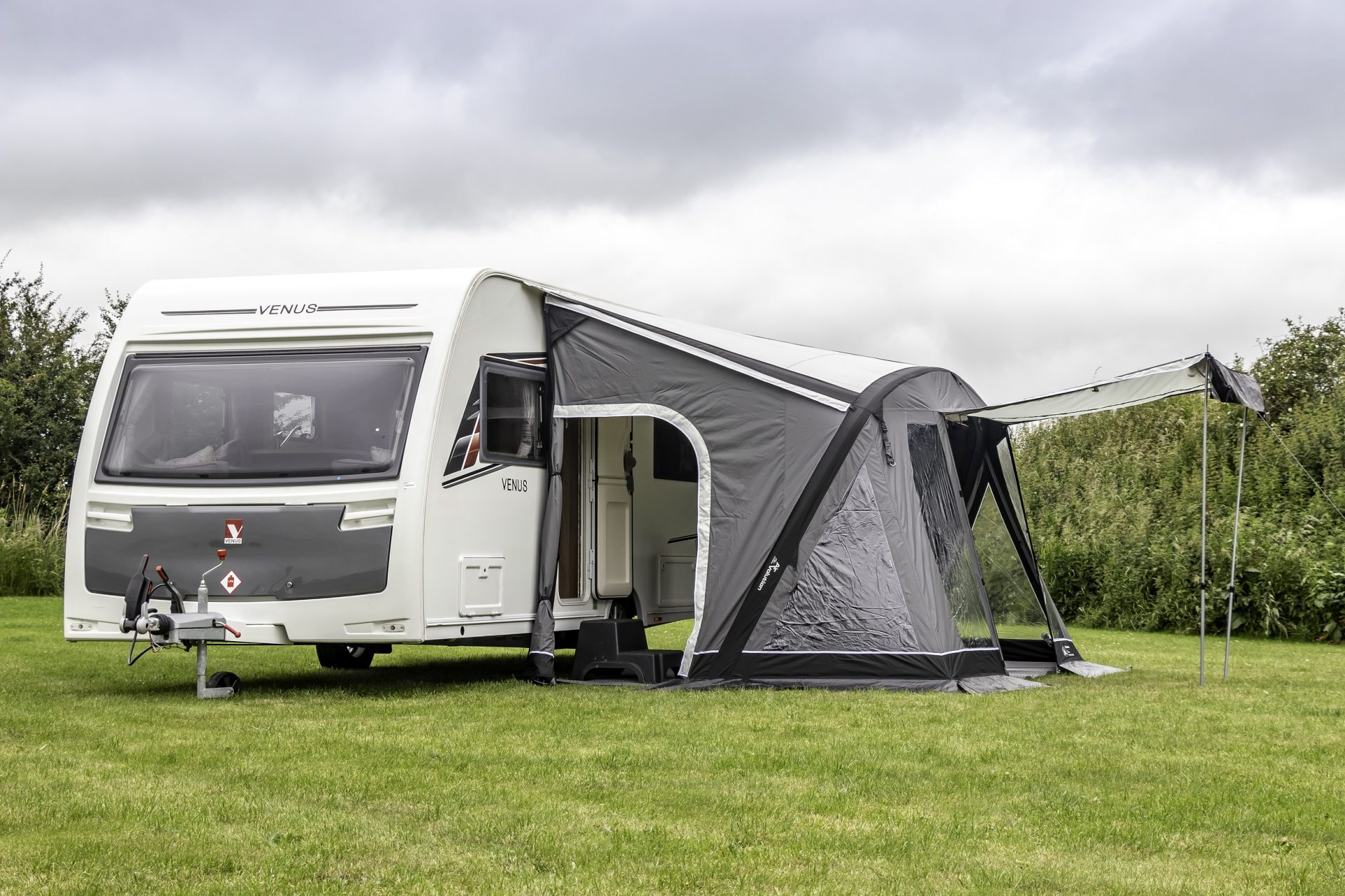 The Swift AIR Extreme porch awnings are modelled after SunnCamp’s Swift Air awnings, but they are made with their AirVolution Single Inflation technology and 300D PRO-TEK fabric, along with an external peggable mud wall made of PVC mesh for added weather protection. With its many features, including side sun canopy compatibility, zipped curtains on all windows, and LED light pockets, this awning is high-spec but easy to set up and take down.
