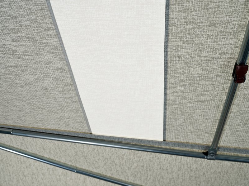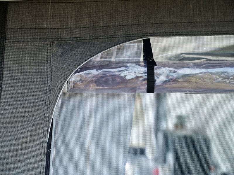 - A light strip in the roof and large clear film windows make the awning bright and welcoming.