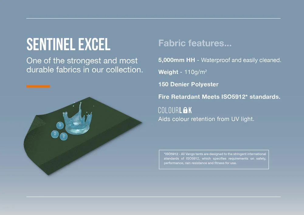 - Sentinel Excel Fabric: Highly waterproof and durable 150D embossed fabric with a 5,000mm HH rating. Includes ColourLok technology for increased longevity.