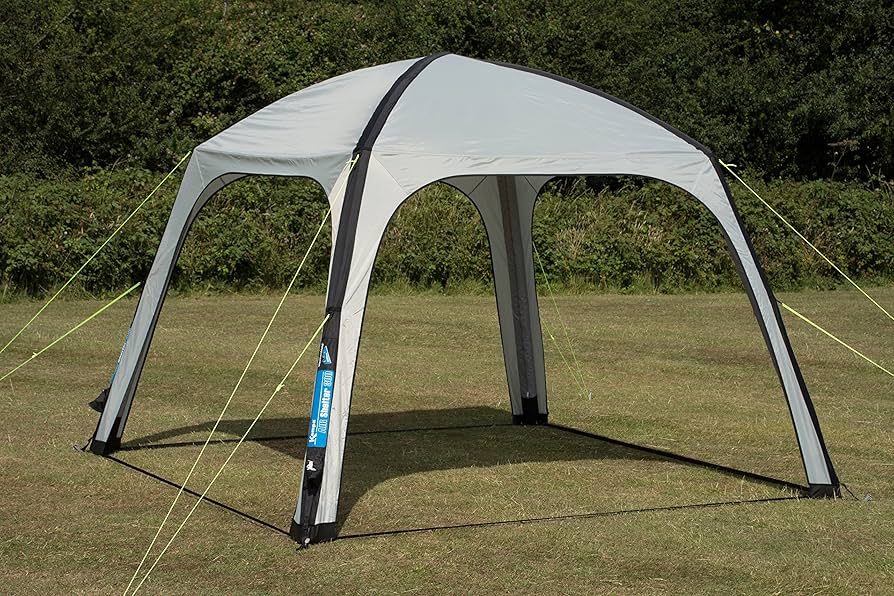 The AIR shelter pitches very quickly, and the included hand pump makes it easy to inflate it. Just peg the four corners and use the two inflation points on the outside of the shelter. Sturdy guylines and provided pegs keep the shelter stable, while tensioning straps on the underside guarantee that a square shape is maintained. Four side panels are included as standard for privacy and extra weather protection.