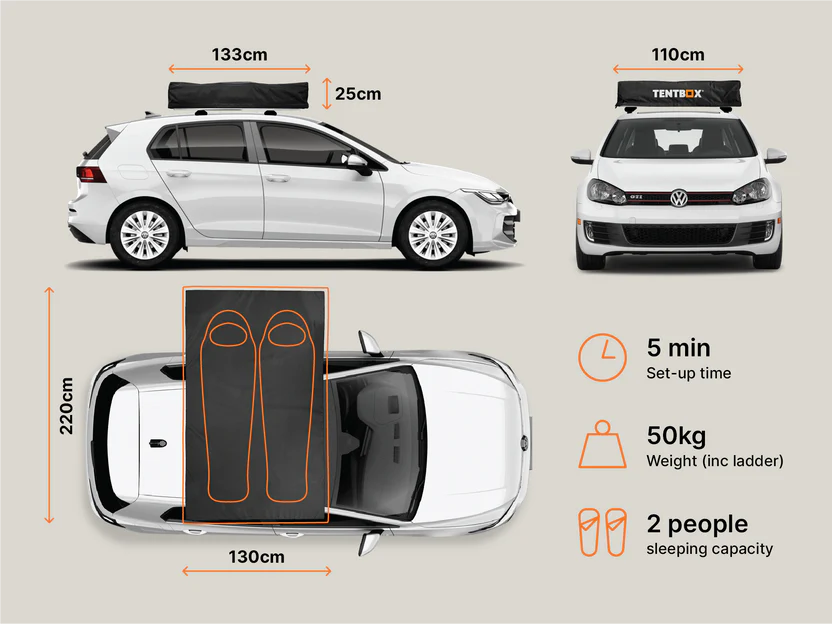 It opens manually in around 5 minutes, with a simple fold-out design that’s easy to master. Inside, a plush fitted mattress (that stays inside when packed down) and double skylights create a cosy, airy sleeping space.