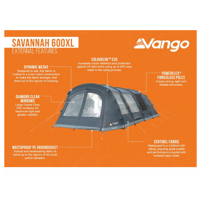 Crafted by Vango, a trusted name in outdoor gear, the Savannah 600XL provides ample room for up to six people, making it perfect for creating unforgettable memories with loved ones. Its advanced materials and clever design ensure exceptional weather resistance, ventilation, and privacy, so you can relax in comfort no matter the conditions.