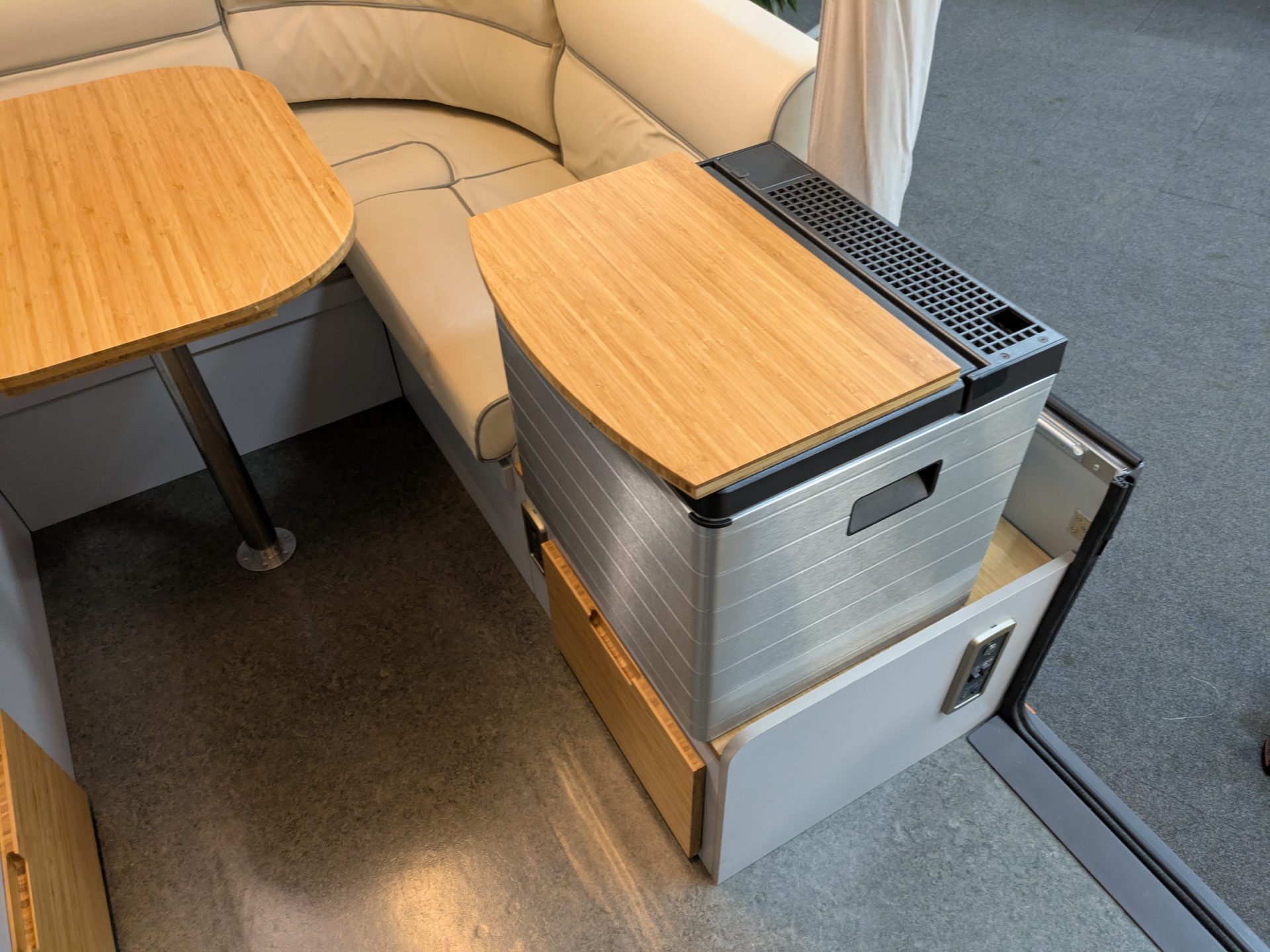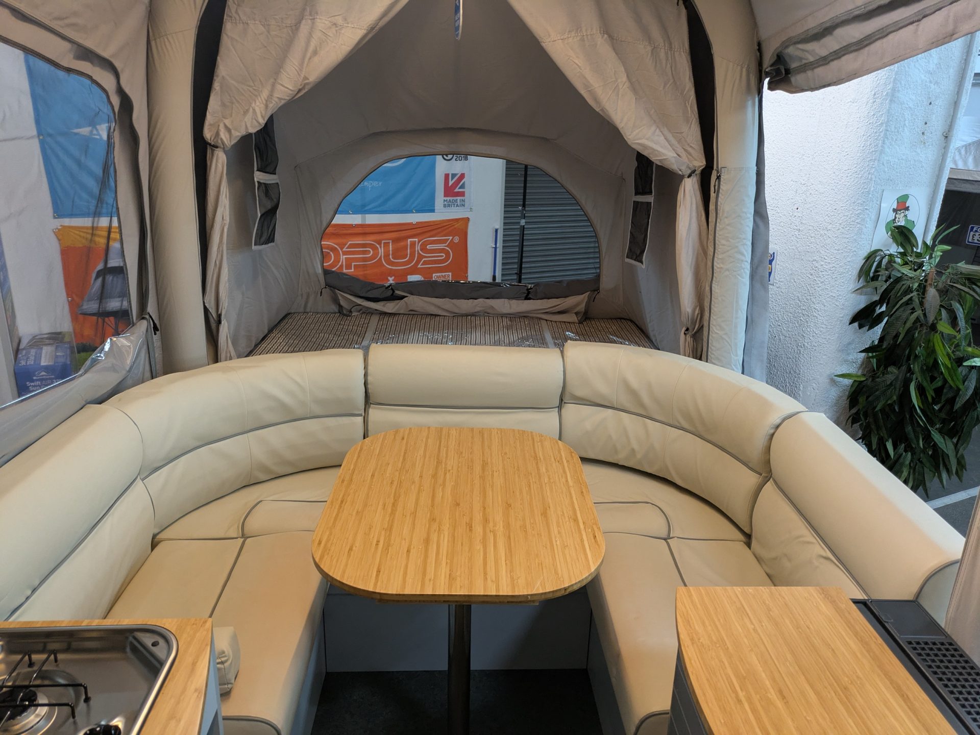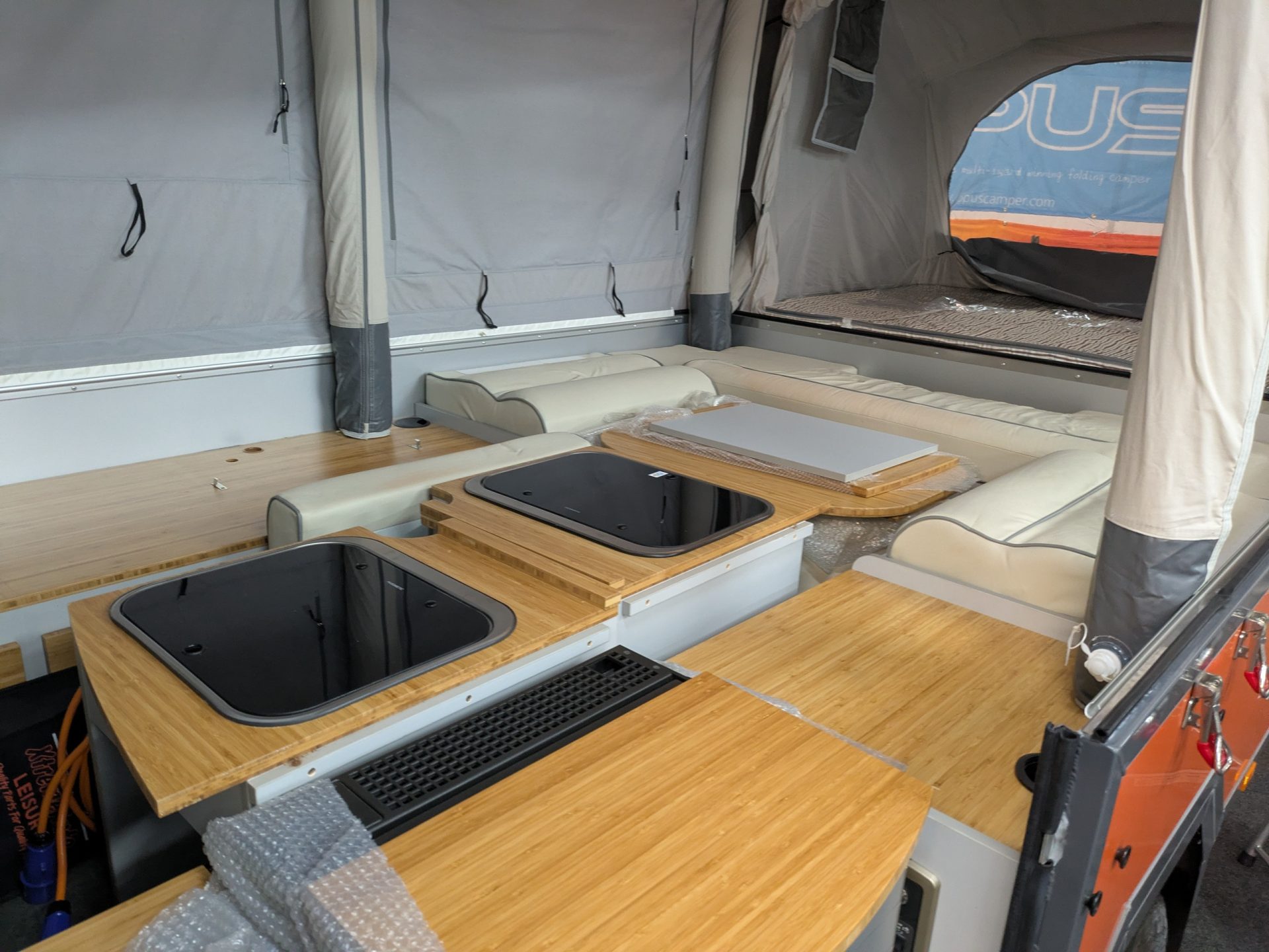 In only a few minutes, AIR Opus can inflate in a matter of minutes thanks to Air Pole technology and the built in electric pump. Once you go inside, the interior arrangement is equipped with plush leatherette chairs for relaxation and soft double beds for the ideal night’s sleep. A kitchenette with gas stovetops, a fridge, a microwave, and running water, as well as many other home comforts, are among the amenities. There is also heating for those chilly evenings.